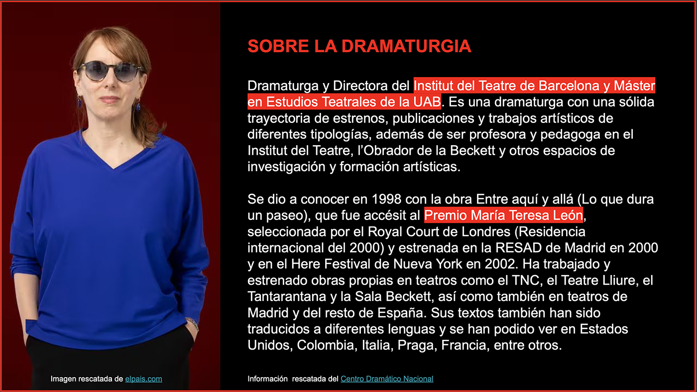 Aquest vincle amb la dramaturga va sorgir gràcies a l’oportunitat de realitzar l’assignatura de pràtiques amb ella (Karen Carreño) a La Tercera fuga. Teatro Nacional de Cataluña.