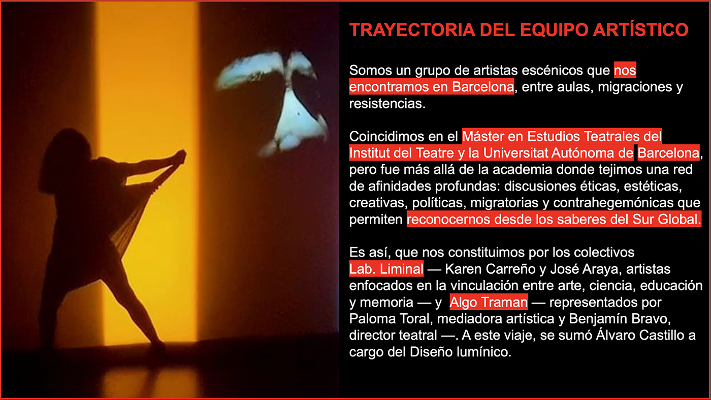 El projecte es troba actualment en les seves primeres etapes d’investigació escènica a Barcelona, amb vistes a la seva estrena a Xile durant el segon semestre del 2026, i amb projecció de circulació a Llatinoamèrica i Europa.